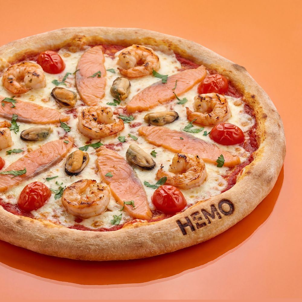 Сыр моцарелла, креветки, лосось, томаты, болгарский перец, зелень, соус красный.