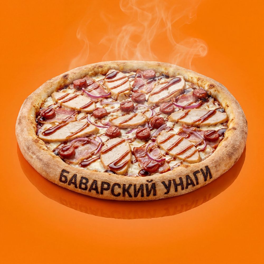 Бекон, куриная грудка, колбаски баварские, лук репчатый, соус «Барбекю», сыр «Моцарелла».