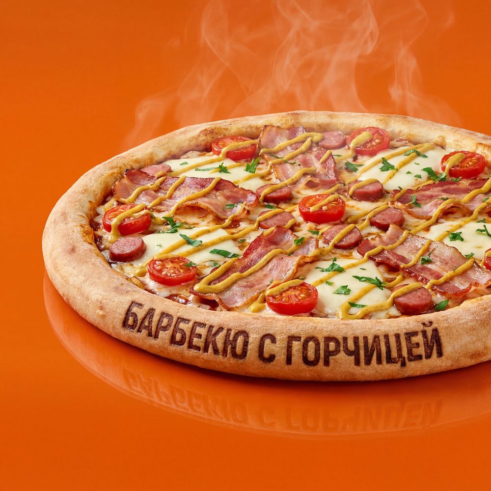 Бекон, сосиски, томат, соус«Горчичный»,сыр «Моцарелла», свежая зелень.