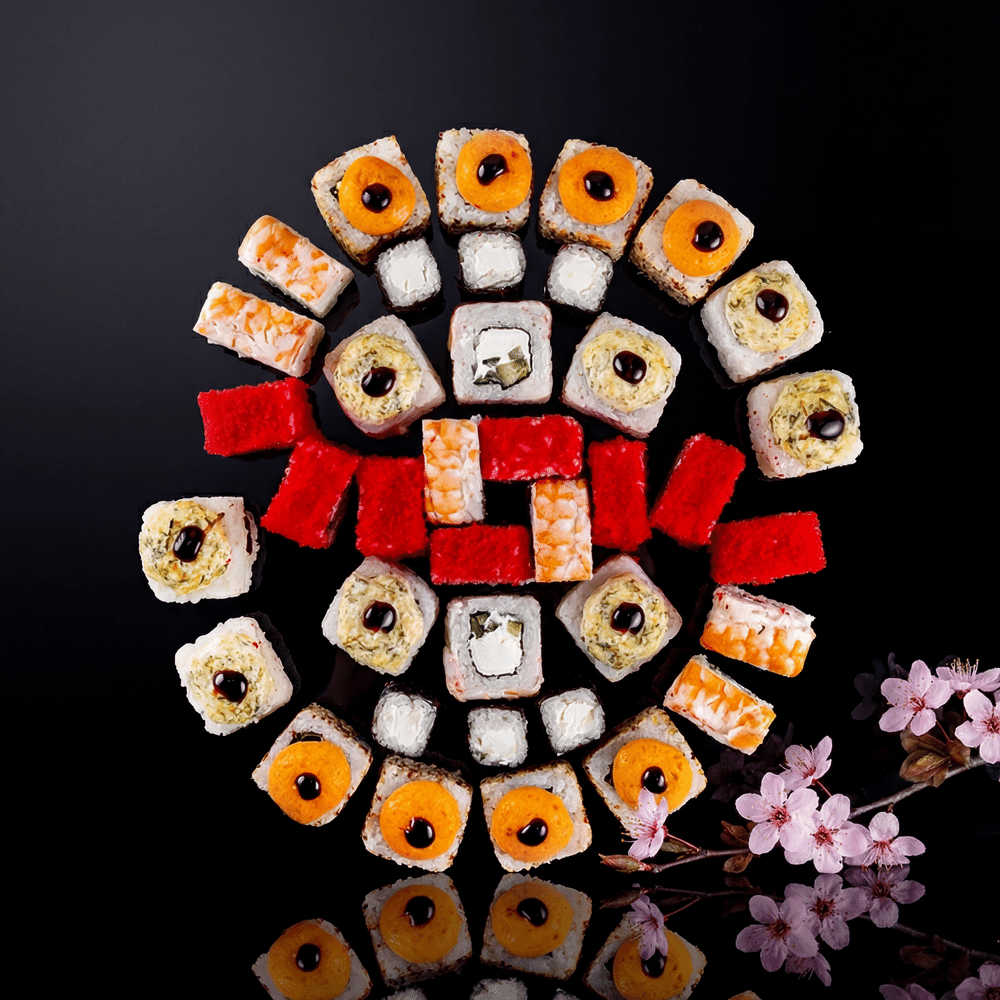 1)Ролл «Аризона»: рис, нори, сливочный сыр, авокадо, тигровая креветка.