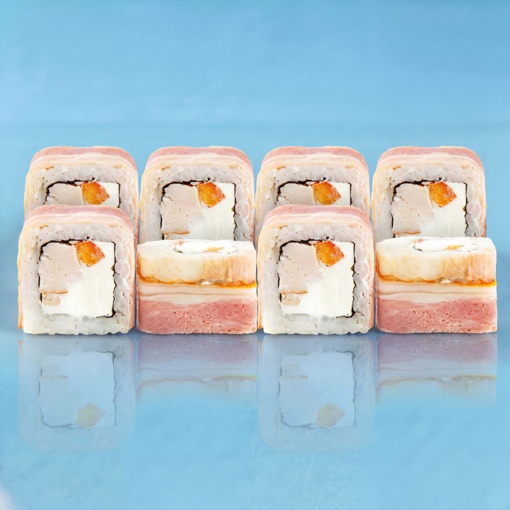 Болгарский перец,копченая куриная грудка, бекон нори, сливочный сыр.
