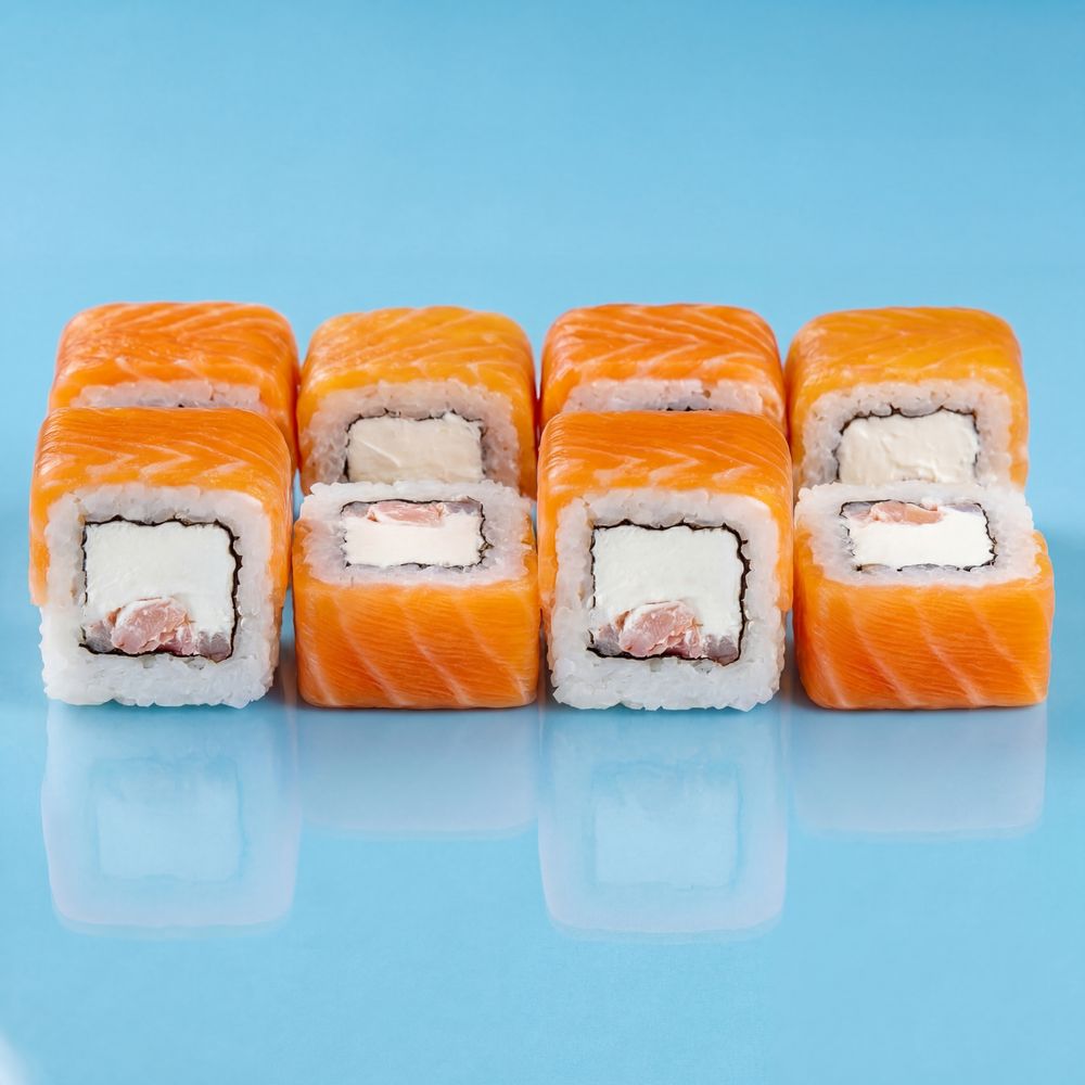 Тигровая креветка, лосось, рис, нори, сливочный сыр.