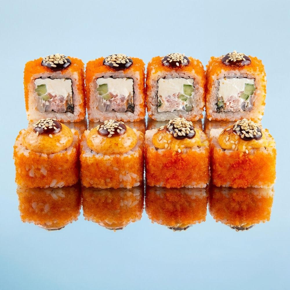 Запеченный рол Рис, нори, сливочный сыр, огурец, окунь, масаго, спайси соус