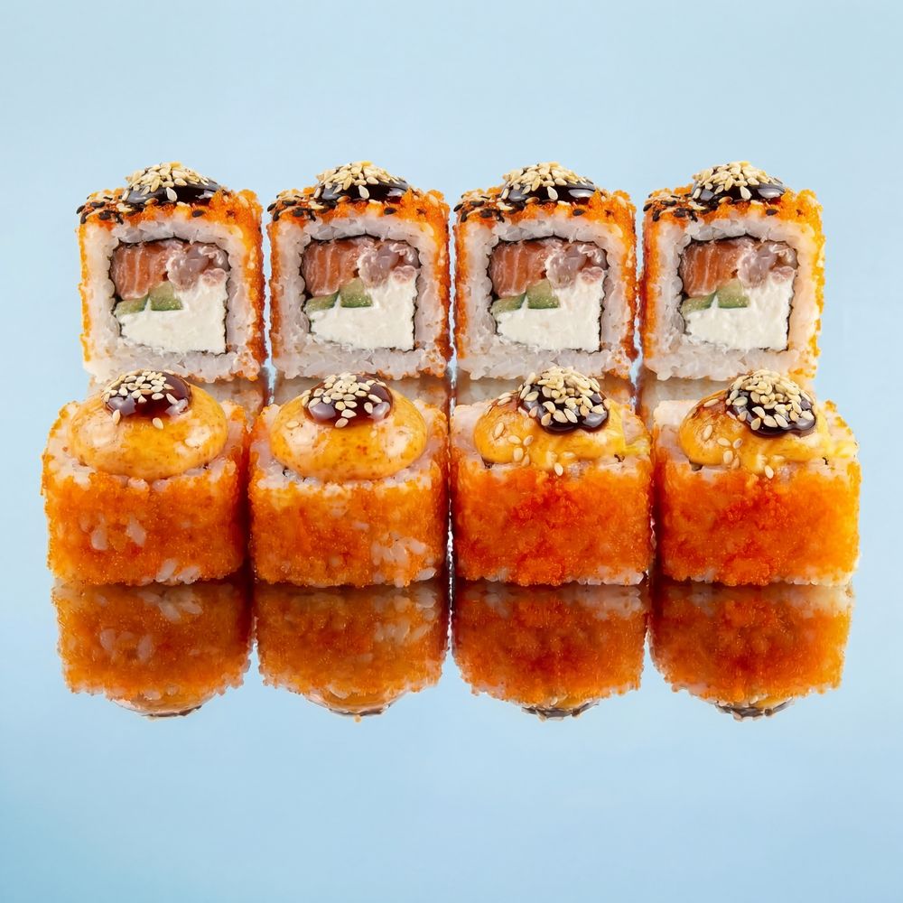 Запеченный рол Рис, нори, сливочный сыр, огурец, лосось, , масаго, спайси соус