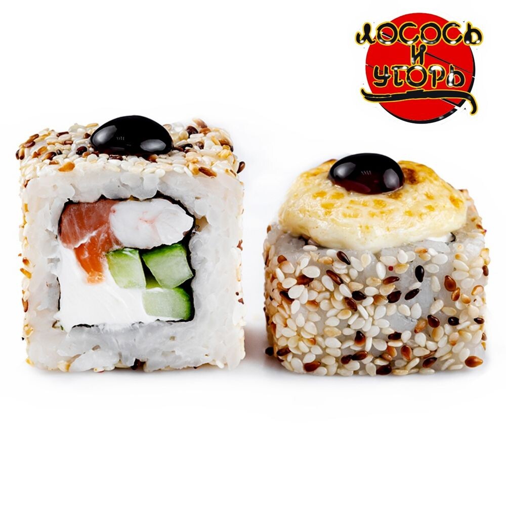 Запеченный рол Рис, нори, лосось, тигровая креветка, сливочный сыр, огурец, кунжут, сырный соус