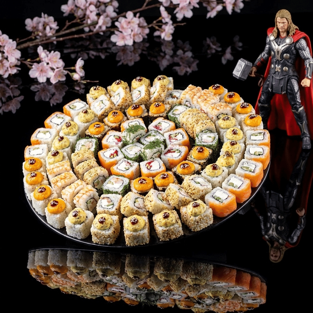 6)Ролл-Джорджия-Рис, нори, сливочный сыр, огурец, курица, кунжут, спайси соус