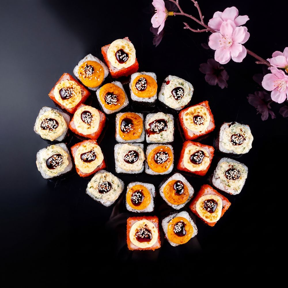 1)Гриль-Рено = Рис, нори, сливочный сыр, огурец, , мидии, масаго, спайси соус