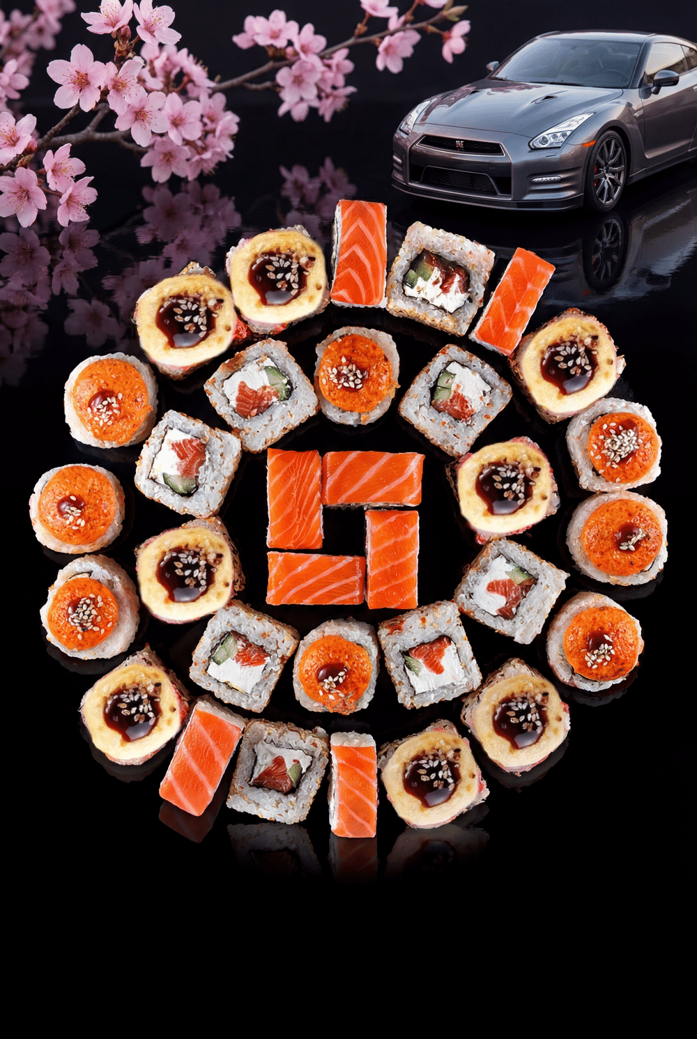 1)Ролл-Юта-Рис, нори, сливочный сыр, огурец, лосось, кунжут
