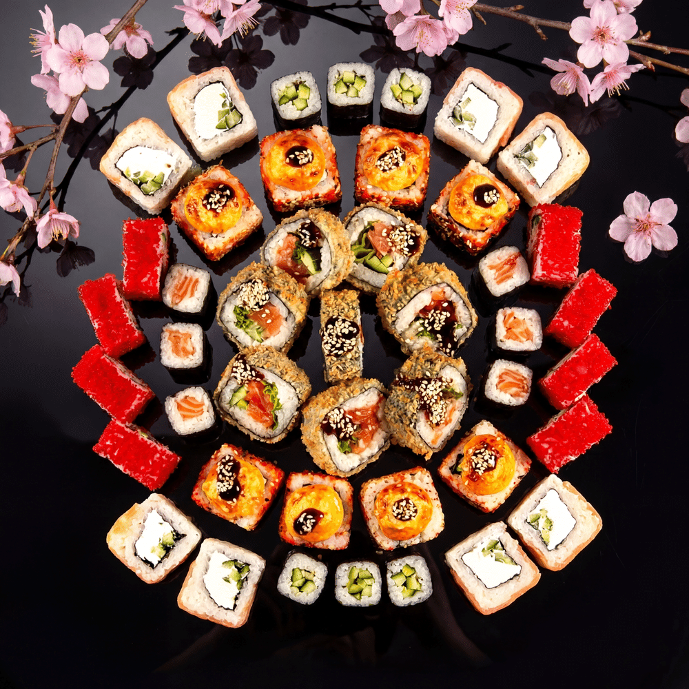 4)Калифорния: рис, нори, краб, огурец, сливочный сыр, масаго