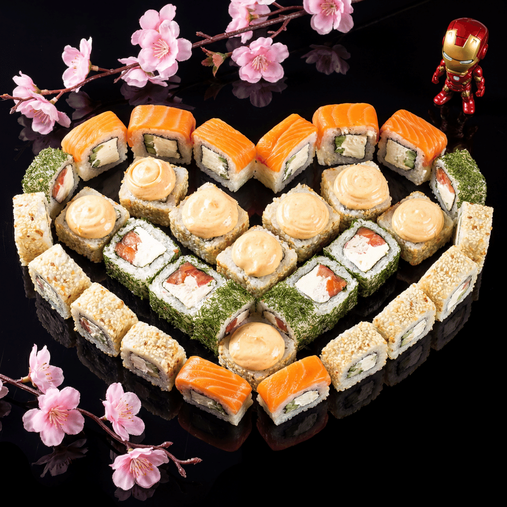 1)Ролл-Юта-Рис, нори, сливочный сыр, огурец, лосось, кунжут