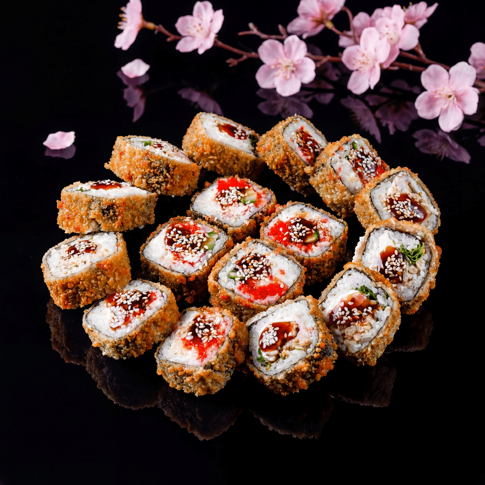 1)Темпура-Небраска-Рис, нори, огурец, лист салата, окунь в кляре 2)Темпура-Мичиган-Рис, нори, сливочный сыр, лист салата ,копченая курица,Спайси внутри