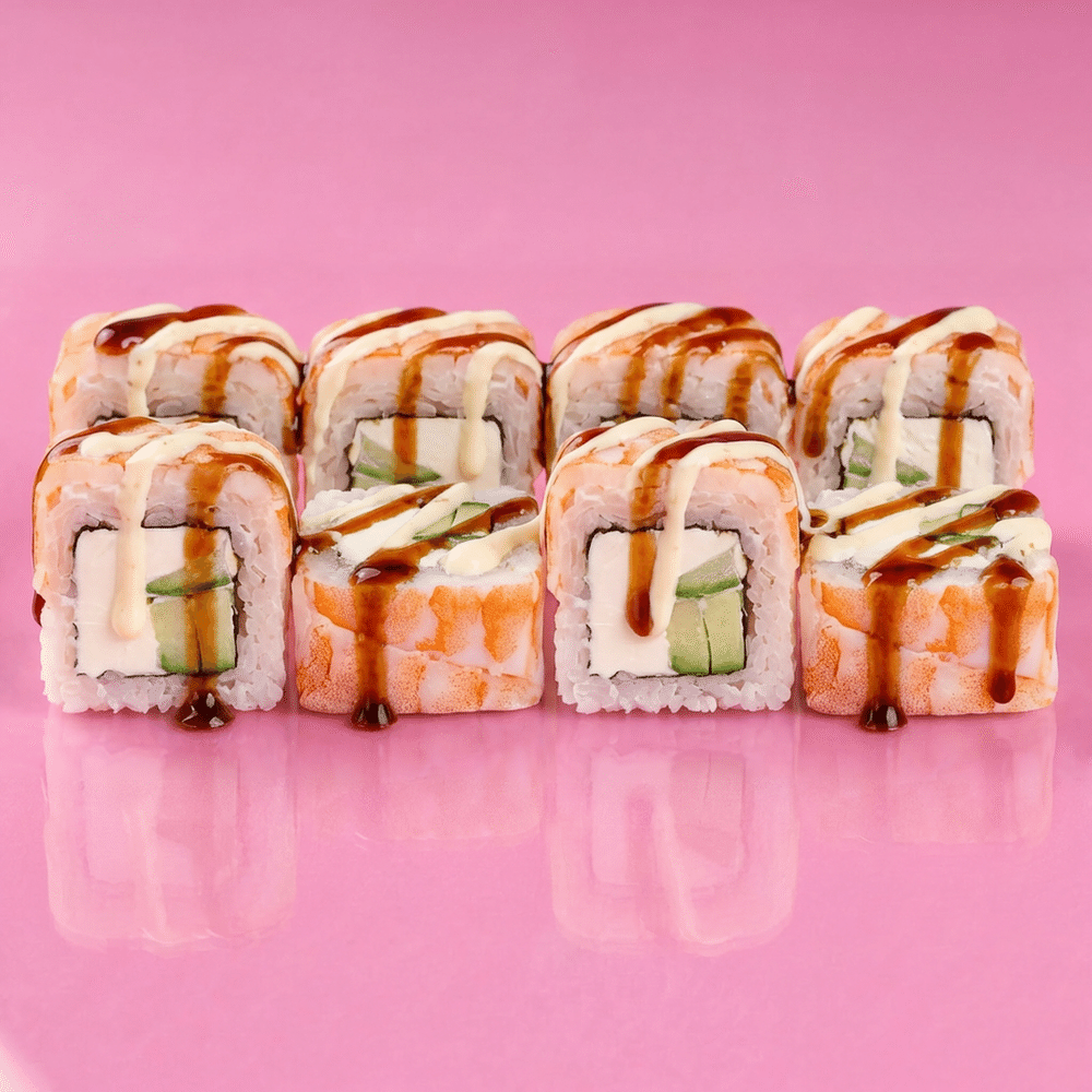 ТВОРОЖНЫЙ СЫР НОРИ АВОКАДО КРЕВЕТКА ПОЛИТ ФИРМЕННЫМ СОУСОМ И УНАГИ