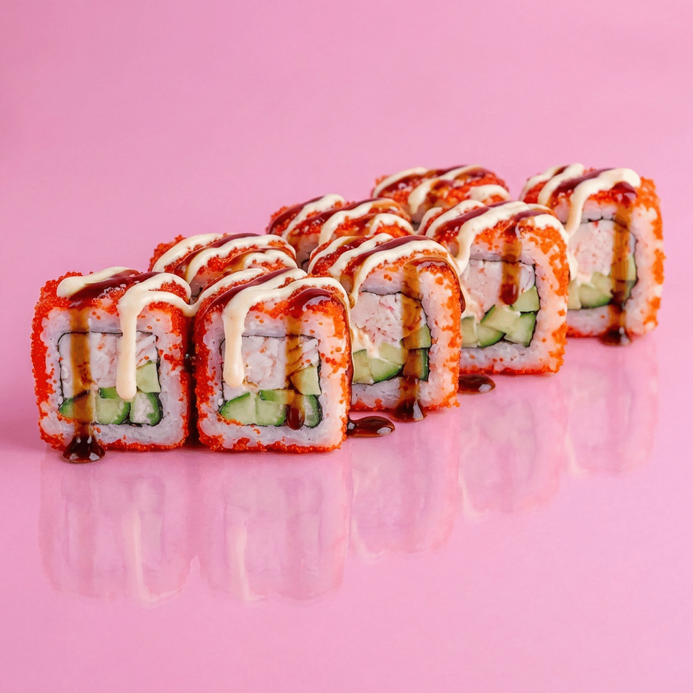 ТВОРОЖНЫЙ СЫР, НОРИ, АВОКАДО, ИМИТАЦИЯ КРАБА, ИКРА ТОБИКО, ПОЛИТ ФИРМЕННЫМ СОУСОМ И УНАГИ.